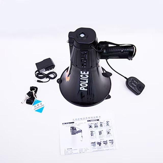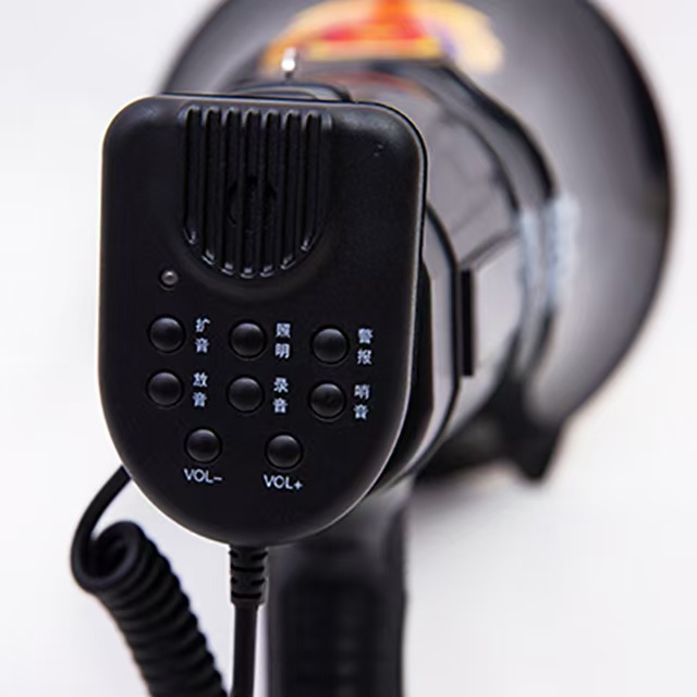 山东中盾的警用大功率喊话器主要有扩音、240秒录音、放音、警报、哨音、照明、MP3(支持U盘和TF卡)、电量显示等功能。